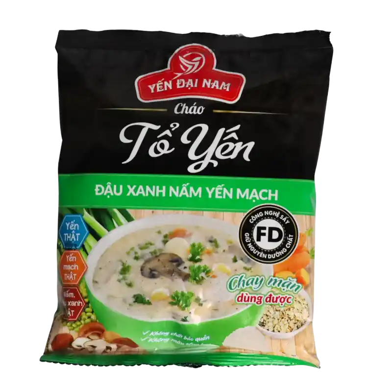Thành phần: Gạo, đậu xanh (150 g/kg), yến mạch (50 g/kg), nấm hương (10 g/kg), nấm tuyết (10 g/kg), tổ yến (1 g/kg), muối, đường, dầu thực vật, dầu điều, hành baro, bột tiêu, bột nước tương, bột chiết xuất nấm, chiết xuất nấm men, chất điều vị (621, 635), rong biển khô, chất xơ, hương liệu rau tổng hợp, chất chống đông vón (551).