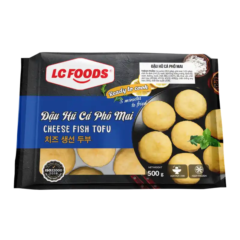 Thành phần: Cá (500 g/kg), nước, phô mai (120 g/kg), dầu thực vật, chất ổn định (1412), bột lòng trắng trứng, đạm đậu nành, đường, muối, chất điều vị (621), chất nhũ hóa (450(iii), 452(i), 451(i)), chất chống oxy hóa (316), chất bảo quản (200).