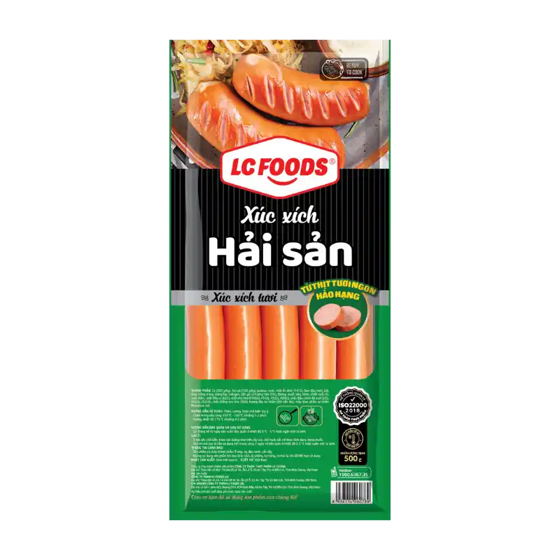 Xúc xích hải sản là sự kết hợp độc đáo giữa cấu trúc mềm mịn của thịt xúc xích cùng với hải sản tươi ngon, đan xen hài hòa giữa mùi vị mặn mà và ngọt ngào. Với màu vàng bắt mắt cũng góp phần thu hút thêm thị giác của người tiêu dùng